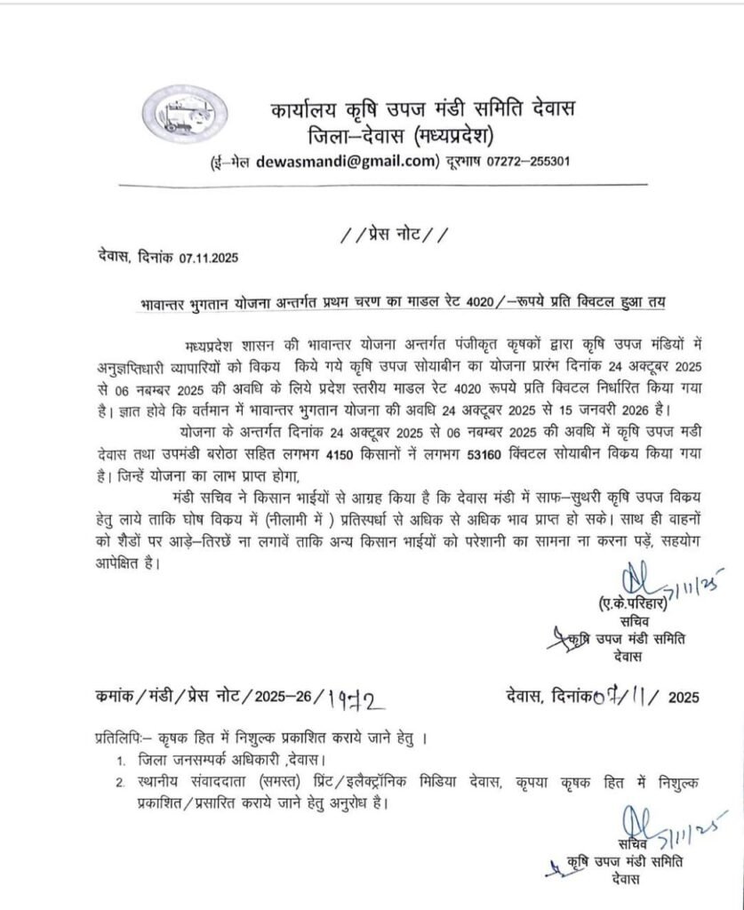 कृषि उपज मंडी समिति देवास ने शुक्रवार, 07 नवंबर 2025 को भावांतर भुगतान योजना के पहले चरण के लिए सोयाबीन का मॉडल रेट ₹4020 प्रति क्विंटल घोषित किया है।