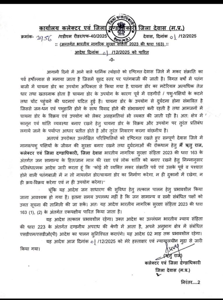 मानव, पशु एवं पक्षियों की सुरक्षा तथा जिले में दुर्घटनाओं की रोकथाम को ध्यान में रखते हुए कलेक्टर एवं जिला दंडाधिकारी श्री ऋतुराज सिंह ने नायलोन डोर/चायना डोर के निर्माण, भंडारण, क्रय–विक्रय और उपयोग पर पूरे देवास जिले में प्रतिबंधात्मक आदेश जारी किए हैं। यह आदेश भारतीय नागरिक सुरक्षा संहिता 2023 की धारा 163 के अंतर्गत पारित किया गया है और तत्काल प्रभाव से अगले 2 महीने तक लागू रहेगा।