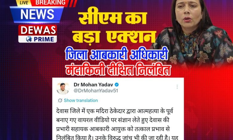 देवास आबकारी विभाग की महिला अधिकारी मंदाकिनी दीक्षित निलंबित।