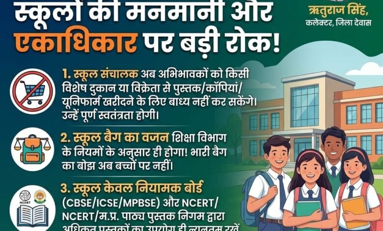 देवास जिले में निजी स्कूलों द्वारा किताबें, कॉपियां और यूनिफॉर्म को लेकर की जाने वाली मनमानी पर प्रशासन ने सख्ती दिखाते हुए अहम निर्देश जारी किए हैं। कलेक्टर एवं जिला दण्डाधिकारी ऋतुराज सिंह ने भारतीय नागरिक सुरक्षा संहिता की धारा 163 के तहत आदेश जारी कर स्कूल संचालकों, पुस्तक प्रकाशकों और विक्रेताओं के एकाधिकार को समाप्त करने के निर्देश दिए हैं।